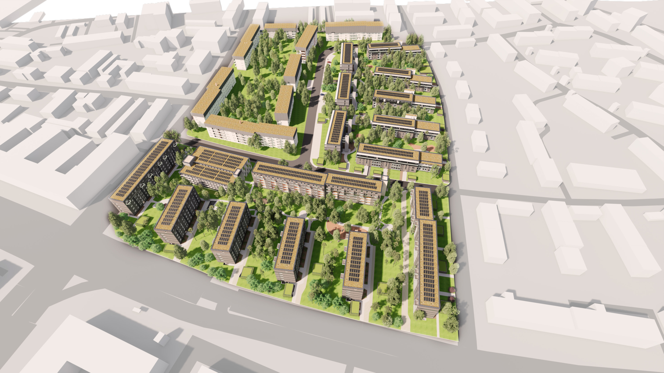 Zwischenzeitlich haben wir einen Masterplan entwickelt, der im ganzen Quartier neben der Aufwertung und Neugestaltung der Freianlagen auch eine energetischen Sanierung samt ein- bis zwei-geschossiger Aufstockung für alle anderen neun Gebäude nach dem Muster des Pilot-Projekts vorsieht.